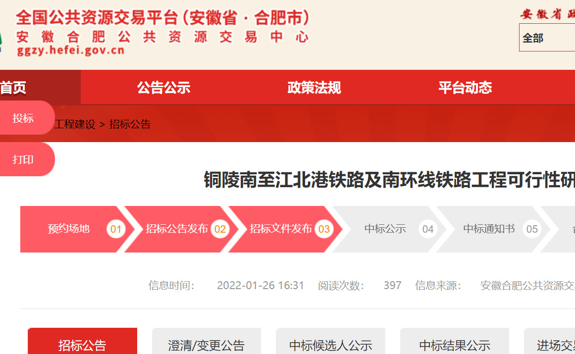 1月26日,工可招標文件在省交易中心順利掛網(wǎng)招標。銅陵南至江北港鐵路及南環(huán)線鐵路工程項目是銅陵市鐵路網(wǎng)的重要組成部分。該線路自銅陵南站接出,沿銅九鐵路東側向南敷設,依次下穿銅九鐵路、寧安高鐵,沿京臺高速與民福家園之間北行,跨過既有京臺高速,經(jīng)G3銅陵長江公鐵大橋過江,西行至陳瑤湖鎮(zhèn),設銅陵江北站,后線路折向南,區(qū)間接軌于在建江北港鐵路專用線,引入江北港站,線路全長27.579km。南環(huán)線由銅陵南至江北港鐵路區(qū)間新建線路所接軌,后線路繼續(xù)北行,跨過濱江大道后接入海螺水泥廠專用線,新建線路長度2.958km。項目總估算是268531.12萬元。