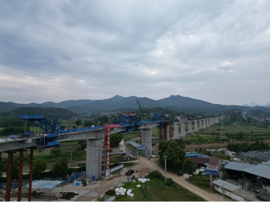 橫埠特大橋連續(xù)梁全長137.2米,一聯(lián)三孔(40+56+40)米,采用懸臂澆筑法施工。橫埠特大橋連續(xù)梁的順利合龍,是繼仙人山隧道、黑山隧道、七家山隧道貫通、首座站房封頂、首榀T梁成功澆筑后,又一重大關(guān)鍵性節(jié)點(diǎn)。