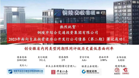 在監(jiān)管環(huán)境愈加趨嚴、資本市場政策嚴格收緊的形式下,集團公司周密部署、充分把握發(fā)行政策,10月26日,市交投集團成功發(fā)行2023年度第二期非公開公司債,規(guī)模5億元,期限2年,票面利率3.98%,主承銷商華安證券,聯(lián)席主承銷商國金證券。
