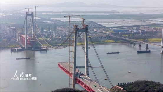 2024年3月22日,在安徽G3銅陵長(zhǎng)江公鐵大橋施工現(xiàn)場(chǎng),施工人員在進(jìn)行主跨鋼梁施工作業(yè)。目前,大橋進(jìn)入主跨鋼梁施工階段,預(yù)計(jì)今年7月完成大橋合龍。大橋全長(zhǎng)11.88公里,主跨988米,項(xiàng)目建成后將具有高速公路、城際鐵路、貨運(yùn)鐵路3種過(guò)江功能,對(duì)完善區(qū)域綜合立體交通網(wǎng)具有重要意義。
